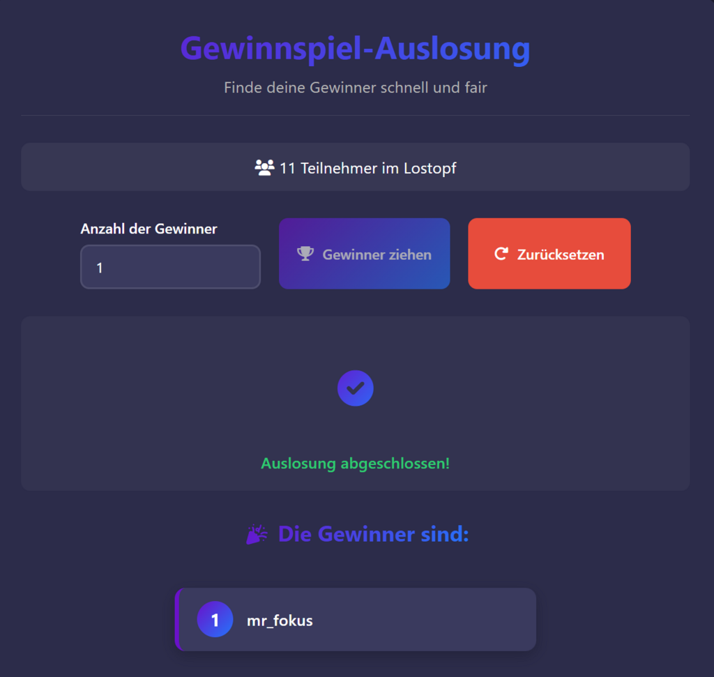 Erstelle und verwalte Gewinnspiele direkt über unsere Plattform. Instagram-Kommentare können automatisch ausgelost werden, ohne manuellen Aufwand. Eine sichere und transparente Auslosungsseite wird dabei automatisch generiert, sodass Teilnehmer und Follower die Ergebnisse jederzeit nachvollziehen können solltest du ein Video aufzeichnen wollen.
